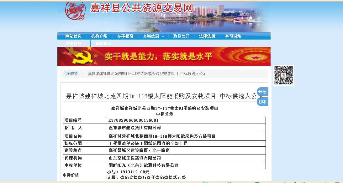 雨昕陽光公司中標嘉祥城建祥城北苑四期太陽能項目