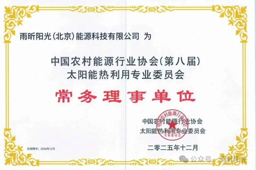 2025年12月18日,中國(guó)太陽(yáng)能熱利用行業(yè)年會(huì)在青島隆重開幕。本屆年會(huì)以“不忘初心、團(tuán)結(jié)奮進(jìn)、新質(zhì)發(fā)展”為主題,匯聚了行業(yè)協(xié)會(huì)領(lǐng)導(dǎo)、專家學(xué)者與企業(yè)代表,共同探尋太陽(yáng)能產(chǎn)業(yè)的高質(zhì)量發(fā)展之路。作為中國(guó)農(nóng)村能源行業(yè)協(xié)會(huì)太陽(yáng)能熱利用專委會(huì)常務(wù)理事單位,雨昕陽(yáng)光受邀出席本次盛會(huì),并憑借突出的行業(yè)貢獻(xiàn)與創(chuàng)新成果,一舉榮獲“新質(zhì)生產(chǎn)力發(fā)展企業(yè)”“太陽(yáng)能熱利用誠(chéng)信企業(yè)”及“草根精神杯”等多項(xiàng)榮譽(yù)。