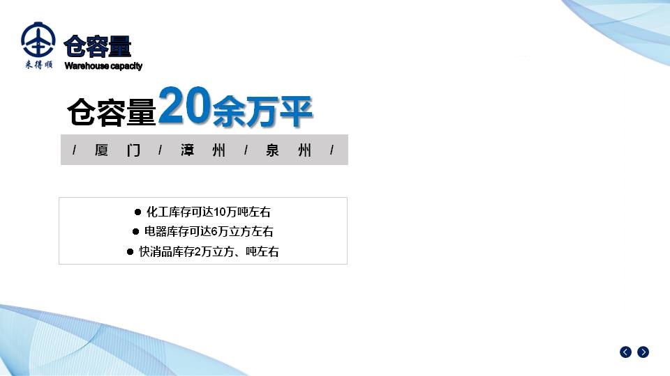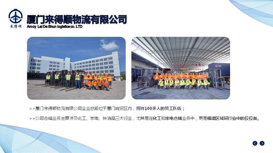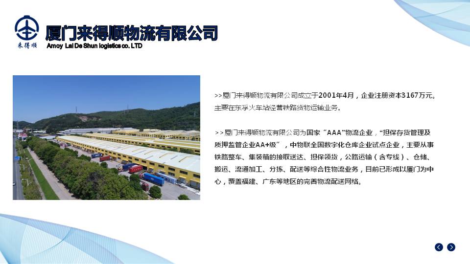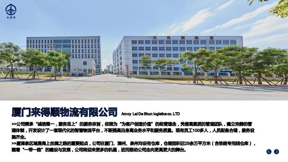 廈門來得順物流有限公司成立于2001年3 月,經(jīng)過多年經(jīng)營和發(fā)展,目前公司注冊資本 達(dá)3167萬元,擁有7個倉儲庫房,倉儲面積達(dá)25萬平,員工隊伍120多人,,主要從事鐵路整車、集裝箱的接取送達(dá)、擔(dān)保領(lǐng)貨,公路運輸(含專線)、倉儲、搬運、流通加工、分揀、配送等綜合性物流業(yè)務(wù),目前已形成以廈門為中心,覆蓋福建、廣東等地區(qū)的完善物流配送網(wǎng)絡(luò)。公司為國家“AAA”物流企業(yè),是“廈門市物流協(xié)會副會長單位”, “擔(dān)保存貨管理及質(zhì)押監(jiān)管企業(yè)AA+級”,中物聯(lián)全國數(shù)字化倉庫企業(yè)試點企業(yè),榮獲“廈門市市級高新技術(shù)企業(yè)”稱號。
