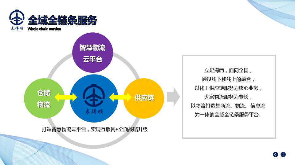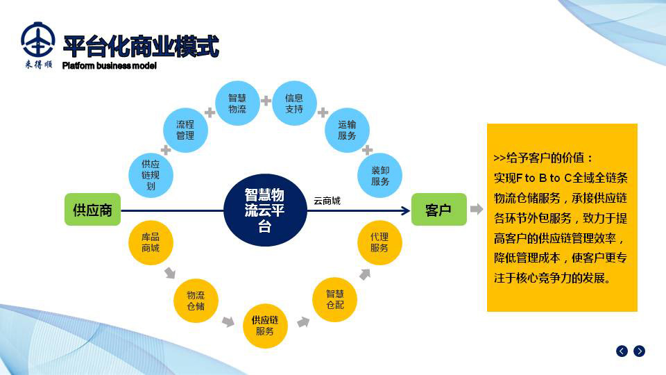 公司秉承“誠信第一,服務(wù)至上”的服務(wù)宗旨,依照為“為客戶創(chuàng)造價值”的經(jīng)營理念,憑借高素質(zhì)的管理團(tuán)隊,建立完善的管理體制,開發(fā)設(shè)計了一套現(xiàn)代化的智慧物流平臺,不斷提高自身高業(yè)務(wù)水平和服務(wù)質(zhì)量。在化工、家電、快消品行業(yè)的倉儲業(yè)務(wù)已成為福建行業(yè)的佼佼者,并長期與中國石油、中國石化、中國神化、中煤能源、海爾電器、格力電器等知名品牌的公司合作,在鐵路運輸領(lǐng)域更是擁有深厚和豐富的資源,隨著物聯(lián)網(wǎng)技術(shù)的發(fā)展,公司先期開發(fā)的倉配管理系統(tǒng),以傳統(tǒng)ERP思路為基礎(chǔ)實現(xiàn)對公司物流倉儲、配送業(yè)務(wù)的管理。隨著企業(yè)互聯(lián)網(wǎng)+時代的到來,公司進(jìn)行戰(zhàn)略轉(zhuǎn)型,意在匯集社會上中小物流公司的資源于平臺上,為F to B to C形成一個全鏈條的物流服務(wù)中心。公司借此將物流服務(wù)延伸致物流全鏈條、結(jié)合物流電商一體化的行業(yè)發(fā)展方向,寄希望在現(xiàn)有系統(tǒng)的基礎(chǔ)上正在努力打造新一代智慧物流與電商相結(jié)合的云平臺,實現(xiàn)F TO C(Factory to Customer)B to B(Bussiness to Bussiness) 、B to C(Bussiness to Customer)商業(yè)服務(wù)模式,同時還提供倉品電商等服務(wù)模塊,要通過這個智慧云平臺實現(xiàn)生產(chǎn)廠家到終端客戶的端到端一體化服務(wù)平臺,無論是物流業(yè)務(wù)提供商,還是廠家、分銷商、渠道商、終端客戶都能實現(xiàn)一站式在平臺內(nèi)解決商品交易及全流通的需求,即完成本企業(yè)電子商務(wù)。。