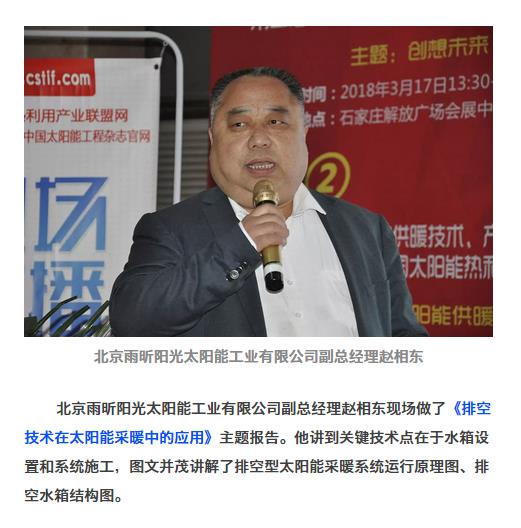 3月17日至19日,為期三天的第十五屆(2018)中國國際太陽能熱利用產(chǎn)品品牌博覽會暨第十三屆中國清潔能源采暖、供熱制冷產(chǎn)品采購節(jié)在石家莊市解放廣場會展中心舉行。本屆展會由中國農(nóng)村能源行業(yè)協(xié)會太陽能熱利用專業(yè)委員會、中國節(jié)能協(xié)會太陽能專業(yè)委員會、中國太陽能熱利用產(chǎn)業(yè)聯(lián)盟主辦,開幕式由《中國太陽能產(chǎn)業(yè)資訊》《中國太陽能工程》執(zhí)行總編曾衡主持。 雨昕陽光公司與會參展,現(xiàn)場展示了公司太陽能熱水、煤改清潔能源取暖等相關的最新產(chǎn)品和工程案例,受到了熱烈關注。 在2018中國太陽能清潔供暖技術、產(chǎn)品與解決方案高峰論壇,北京雨昕陽光太陽能工業(yè)有限公司副總經(jīng)理趙相東現(xiàn)場做了《排空技術在太陽能采暖中的應用》主題報告。他講到關鍵技術點在于水箱設置和系統(tǒng)施工,圖文并茂講解了排空型太陽能采暖系統(tǒng)運行原理圖、排空水箱結構圖。
