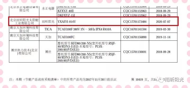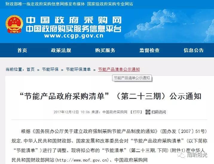 根據(jù)《國務(wù)院辦公廳關(guān)于建立政府強(qiáng)制采購節(jié)能產(chǎn)品制度的通知》(國辦發(fā)〔2007〕51號)規(guī)定,中華人民共和國財(cái)政部、國家發(fā)展和改革委員會(huì)對“節(jié)能產(chǎn)品政府采購清單”(以下簡稱“節(jié)能清單”)進(jìn)行了調(diào)整?,F(xiàn)將擬公布的“節(jié)能清單”(第二十三期,下同)在中華人民共和國財(cái)政部網(wǎng)站(http://www.mof.gov.cn)、中國政府采購網(wǎng)(http://www.ccgp.gov.cn)、國家發(fā)展改革委網(wǎng)站(http://www.ndrc.gov.cn)和中國質(zhì)量認(rèn)證中心網(wǎng)站(http://www.cqc.com.cn)進(jìn)行公示。 雨昕陽光空氣源熱泵、家用太陽能熱水系統(tǒng)兩類產(chǎn)品均入圍。特別是熱泵產(chǎn)品的入圍,是對雨昕陽光空氣能品質(zhì)的再次證明,也是對保衛(wèi)首都藍(lán)天白云,助力北京煤改電的肯定,雨昕陽光人始終堅(jiān)持品質(zhì)決定成敗,不忘初心,砥礪前行。