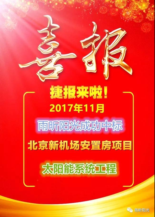 2017年11月,雨昕陽光中標(biāo)北京新機(jī)場(chǎng)安置房項(xiàng)目太陽能系統(tǒng)工程,總合同額約1600余萬元,項(xiàng)目共計(jì)兩個(gè)標(biāo)段:北京新機(jī)場(chǎng)安置房項(xiàng)目(禮賢組團(tuán))1標(biāo)段(0107地塊)太陽能系統(tǒng)工程項(xiàng)目和北京新機(jī)場(chǎng)安置房項(xiàng)目(禮賢組團(tuán))2標(biāo)段(0110、0111地塊)太陽能系統(tǒng)工程項(xiàng)目。