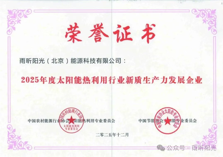 2025年12月18日,中國(guó)太陽(yáng)能熱利用行業(yè)年會(huì)在青島隆重開幕。本屆年會(huì)以“不忘初心、團(tuán)結(jié)奮進(jìn)、新質(zhì)發(fā)展”為主題,匯聚了行業(yè)協(xié)會(huì)領(lǐng)導(dǎo)、專家學(xué)者與企業(yè)代表,共同探尋太陽(yáng)能產(chǎn)業(yè)的高質(zhì)量發(fā)展之路。作為中國(guó)農(nóng)村能源行業(yè)協(xié)會(huì)太陽(yáng)能熱利用專委會(huì)常務(wù)理事單位,雨昕陽(yáng)光受邀出席本次盛會(huì),并憑借突出的行業(yè)貢獻(xiàn)與創(chuàng)新成果,一舉榮獲“新質(zhì)生產(chǎn)力發(fā)展企業(yè)”“太陽(yáng)能熱利用誠(chéng)信企業(yè)”及“草根精神杯”等多項(xiàng)榮譽(yù)。